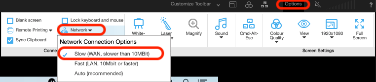 Amend the Network connection options in the remote session. On the customise toolbar, select ‘Options’ and then ‘Network’ and then ‘Slow’. This helps to improve the speed of the session.